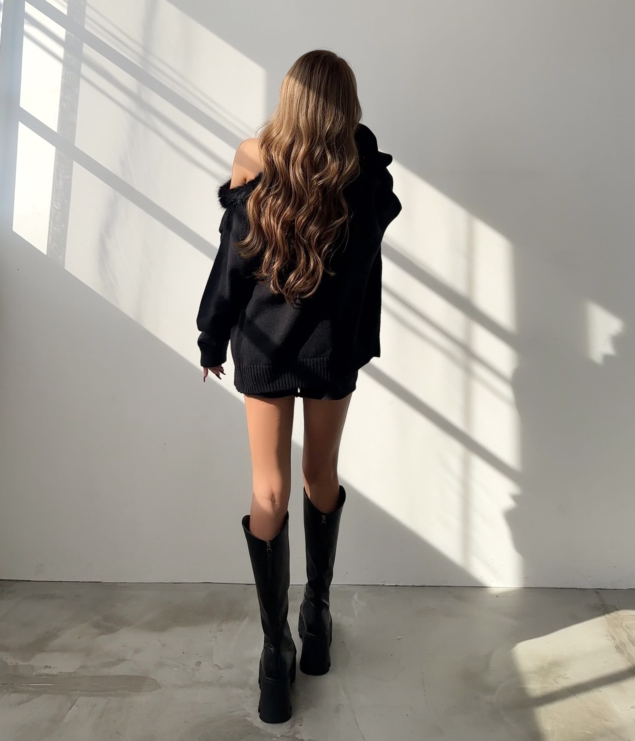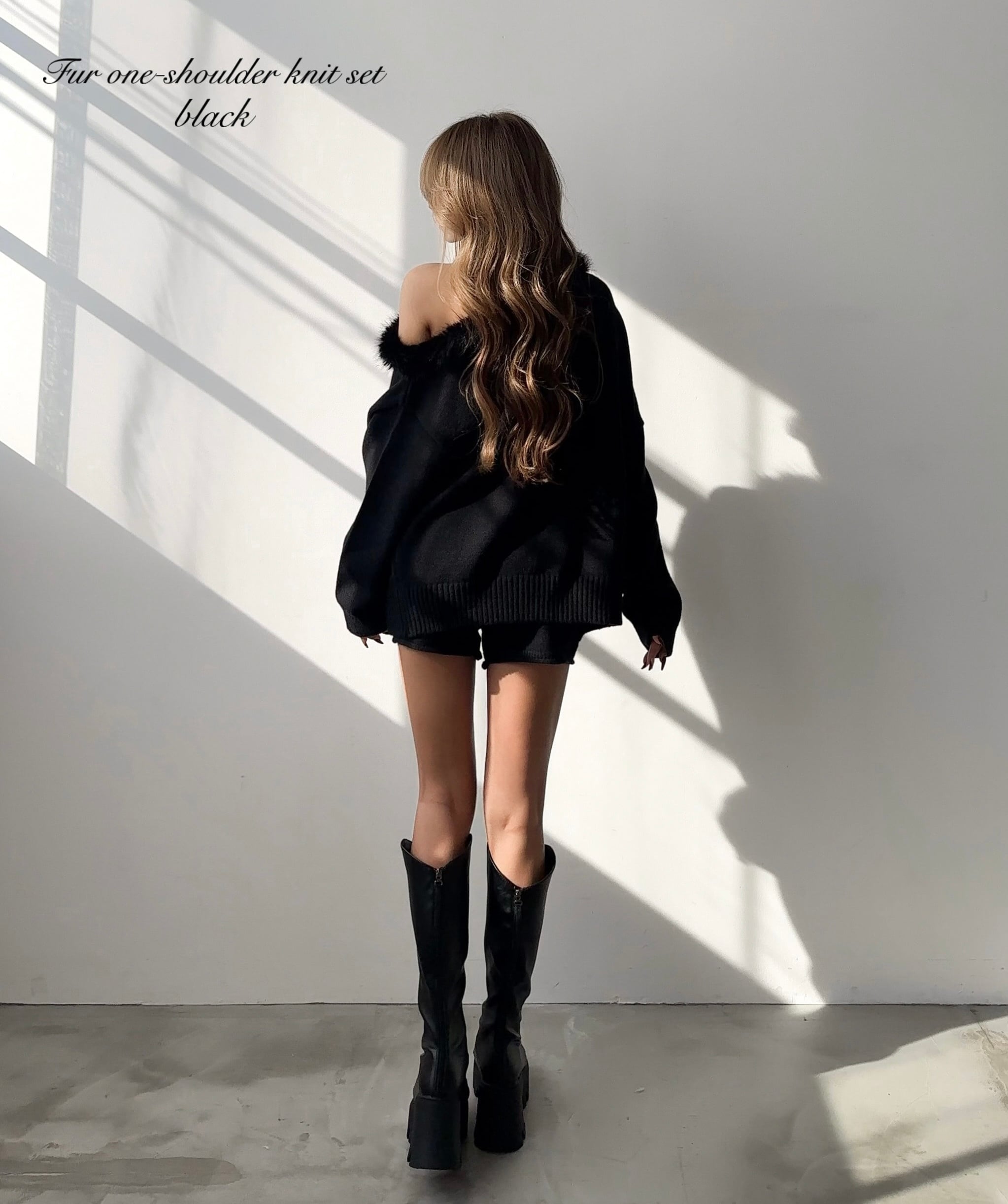 ◻︎ファー付きワンショルダーのルーズトップスとショートパンツのニットセットアップ