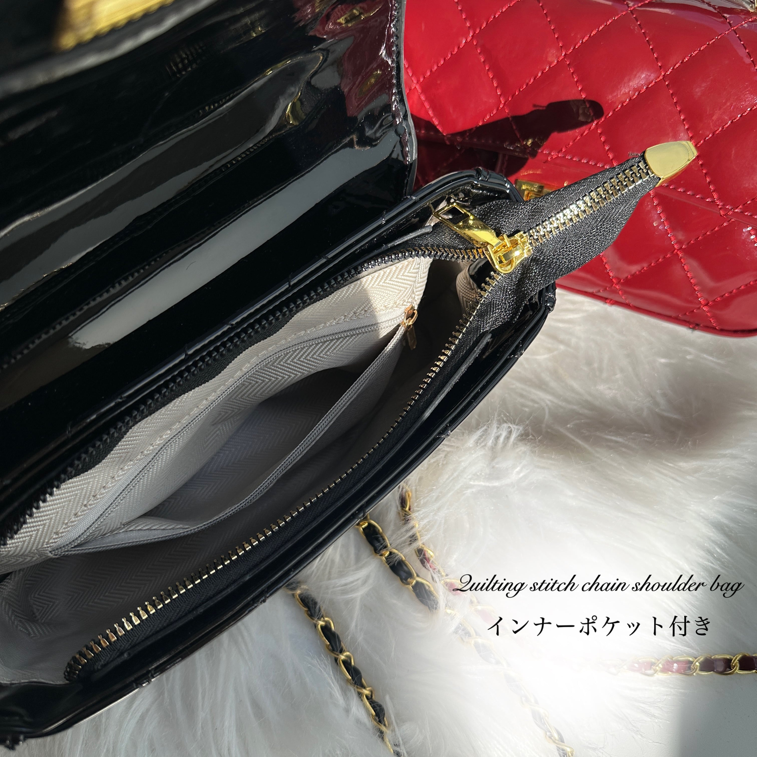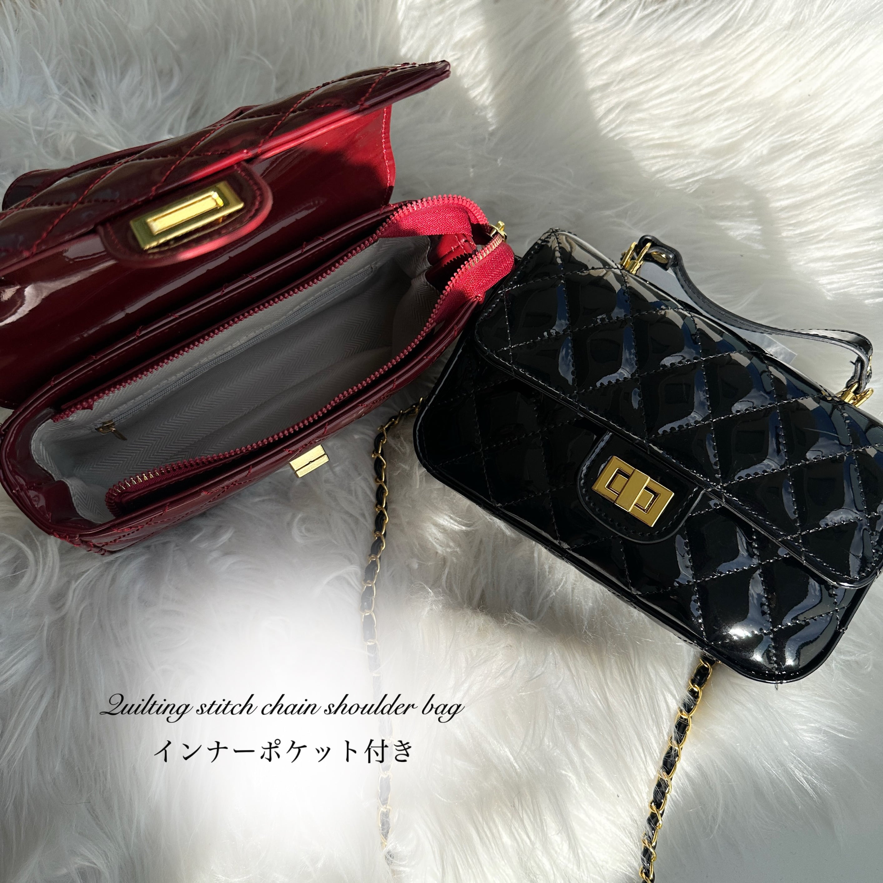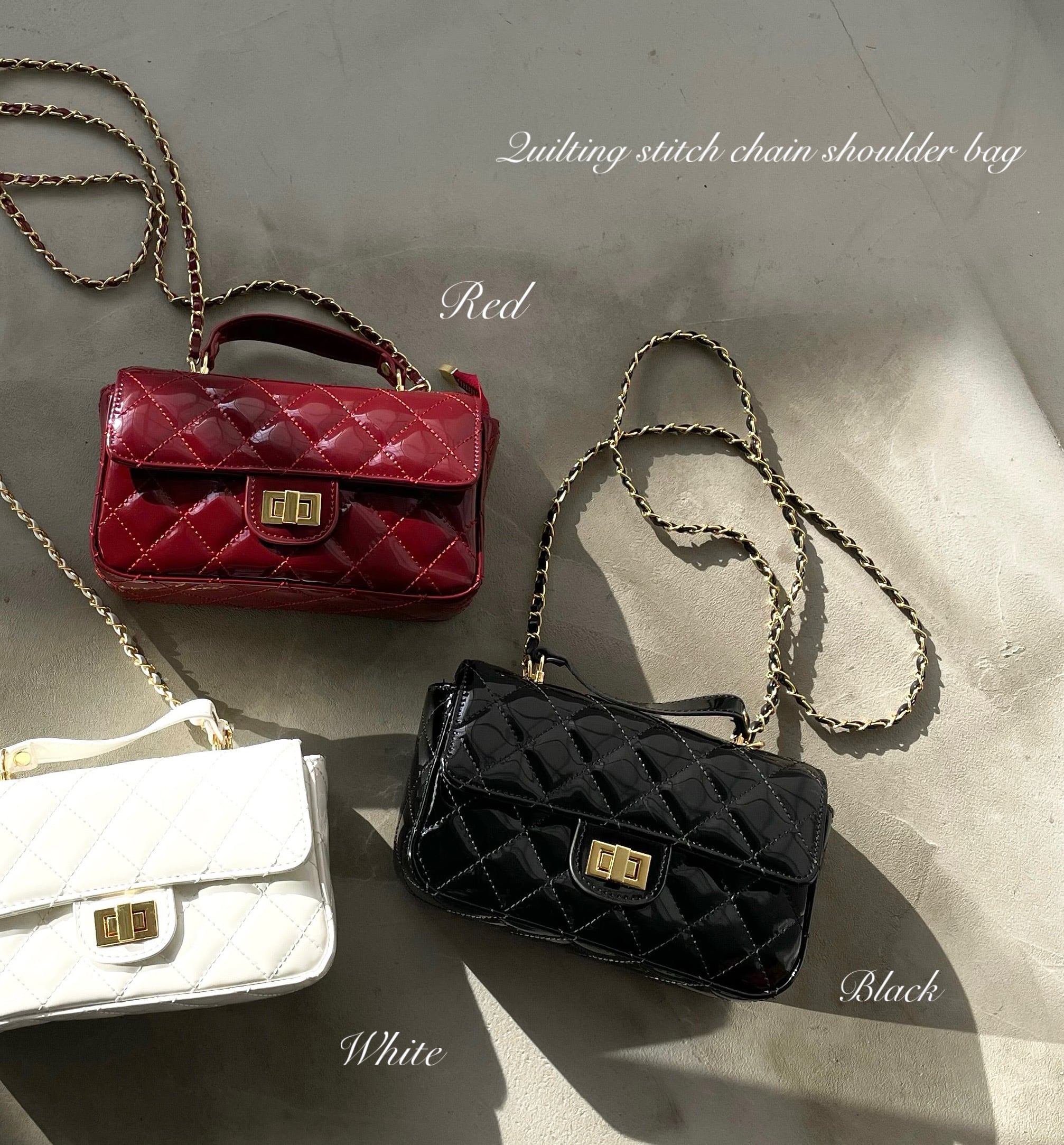 キルティングステッチが施されたゴールドチェーンのショルダーバッグ。