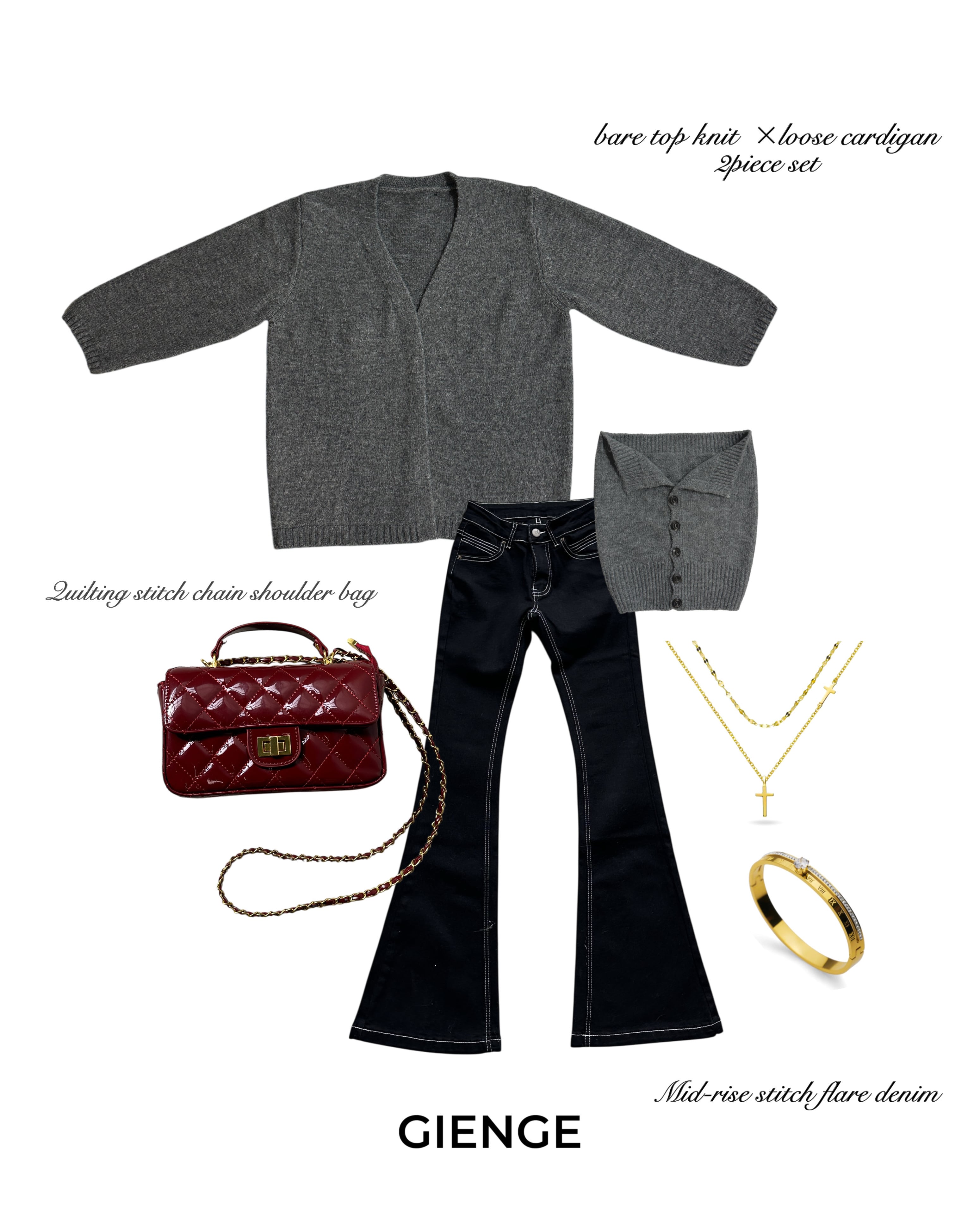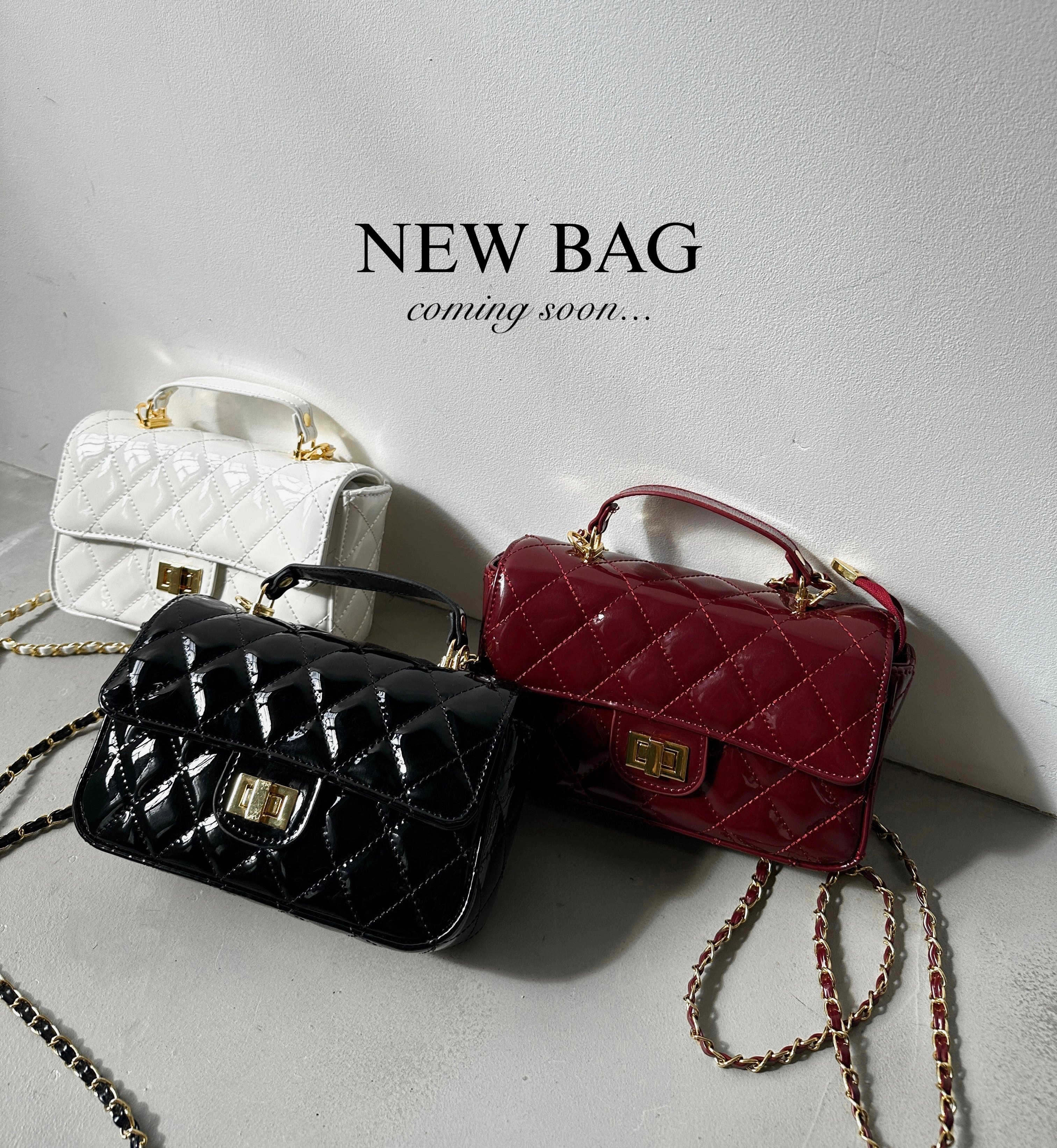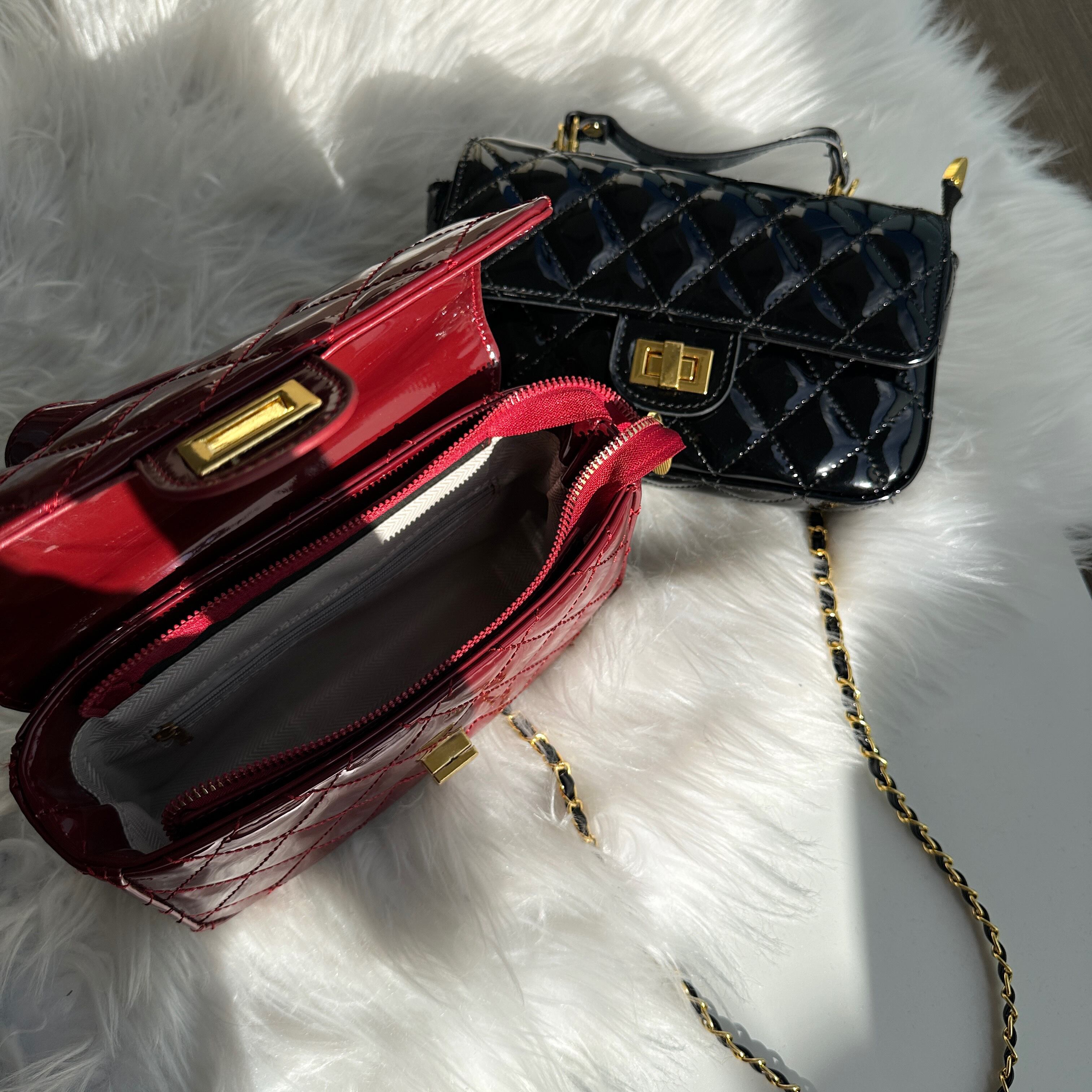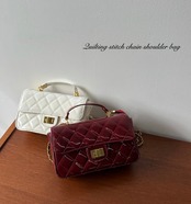 キルティングステッチが施されたゴールドチェーンのショルダーバッグ。