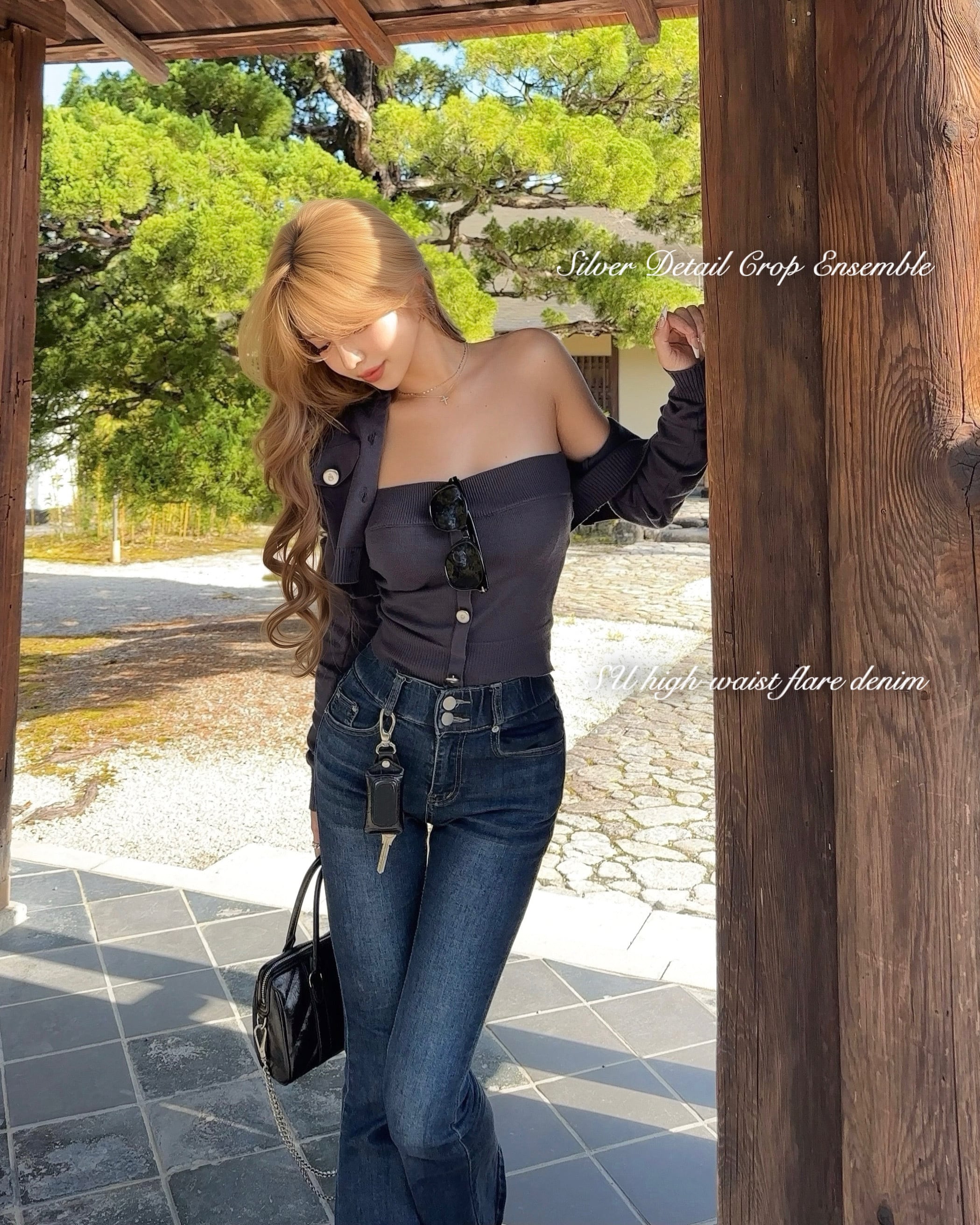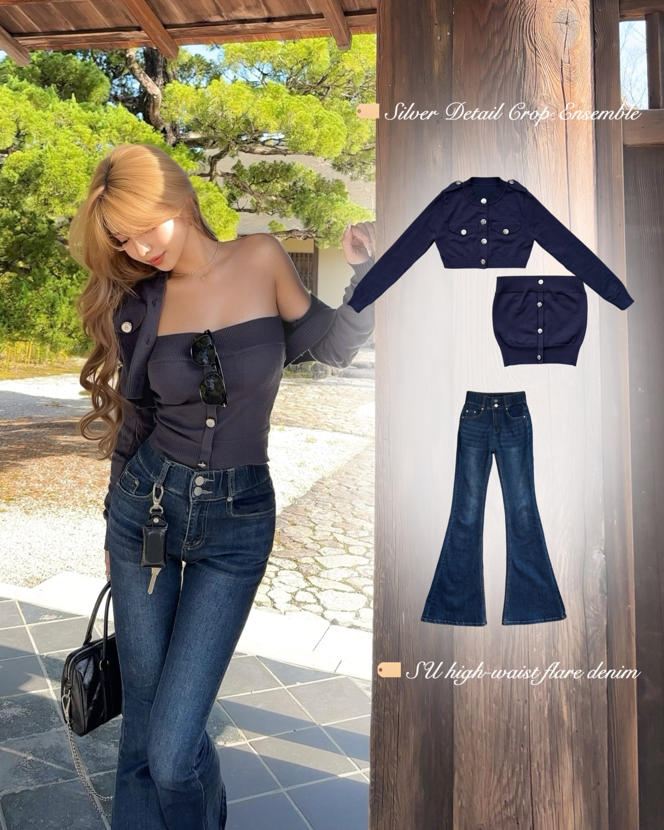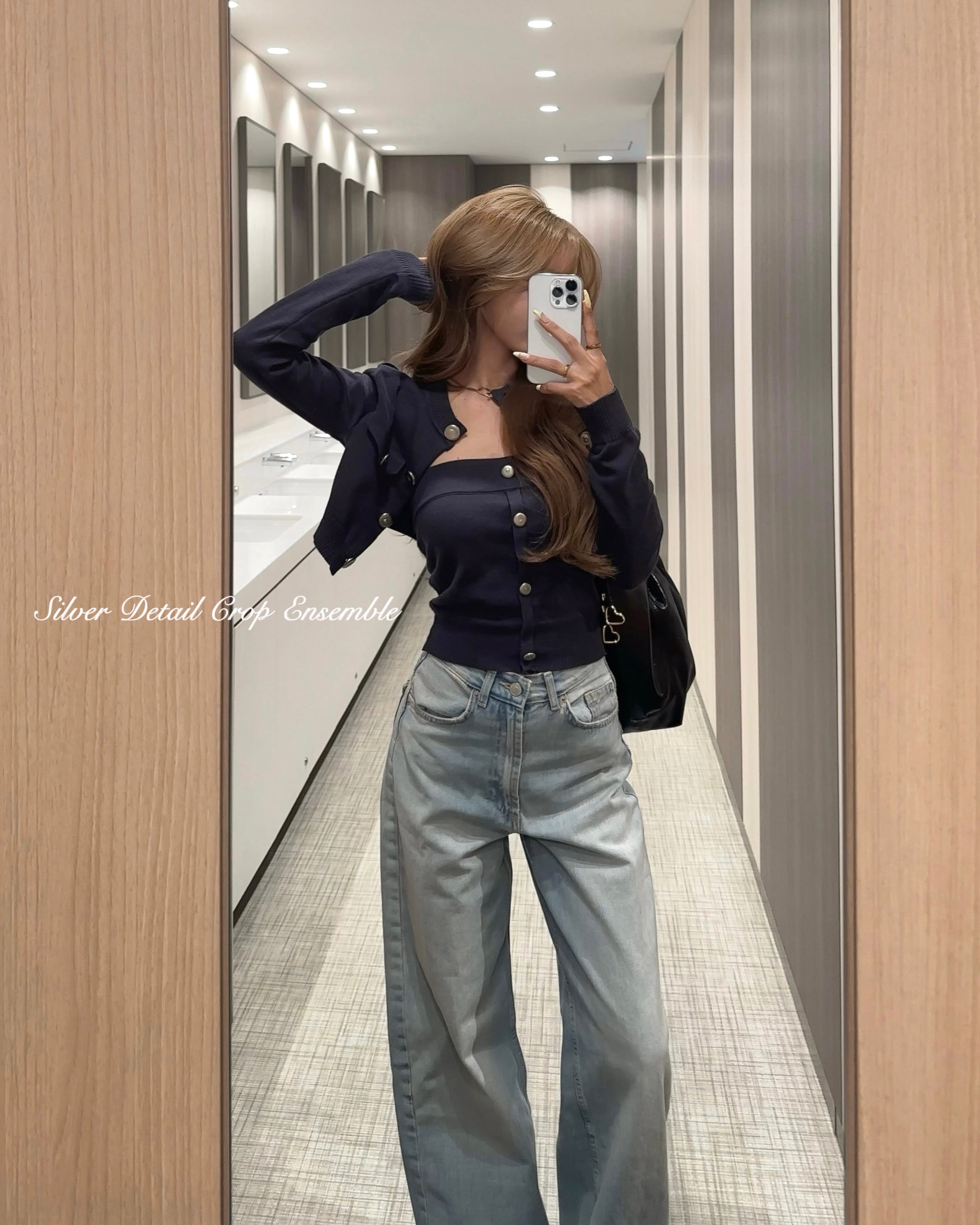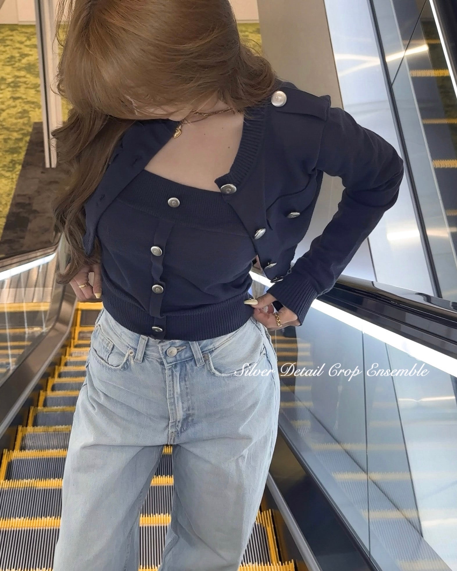 ◻︎シルバーボタンがアクセントになったクロップド丈のアンサンブル。